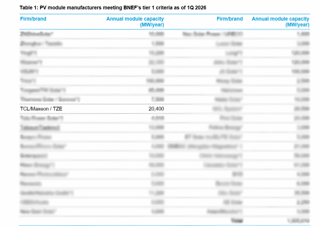 近日,彭博新能源财经发布2026年第一季度全球光伏组件制造商Tier 1名单。TCL Solar业绩表现稳健,持续位居全球光伏组件制造第一梯队,展现出持续向好的发展劲头。